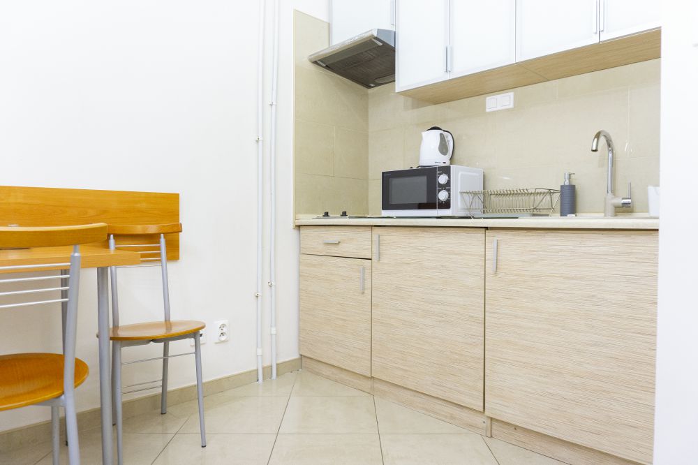 Pokój połączony jest z aneksem kuchennym, w którym na wyposażeniu znajdziemy: lodówkę, kuchenkę elektryczną, kuchenkę mikrofalową, czajnik elektryczny, zlew jednokomorowy oraz zastawę kuchenną.
