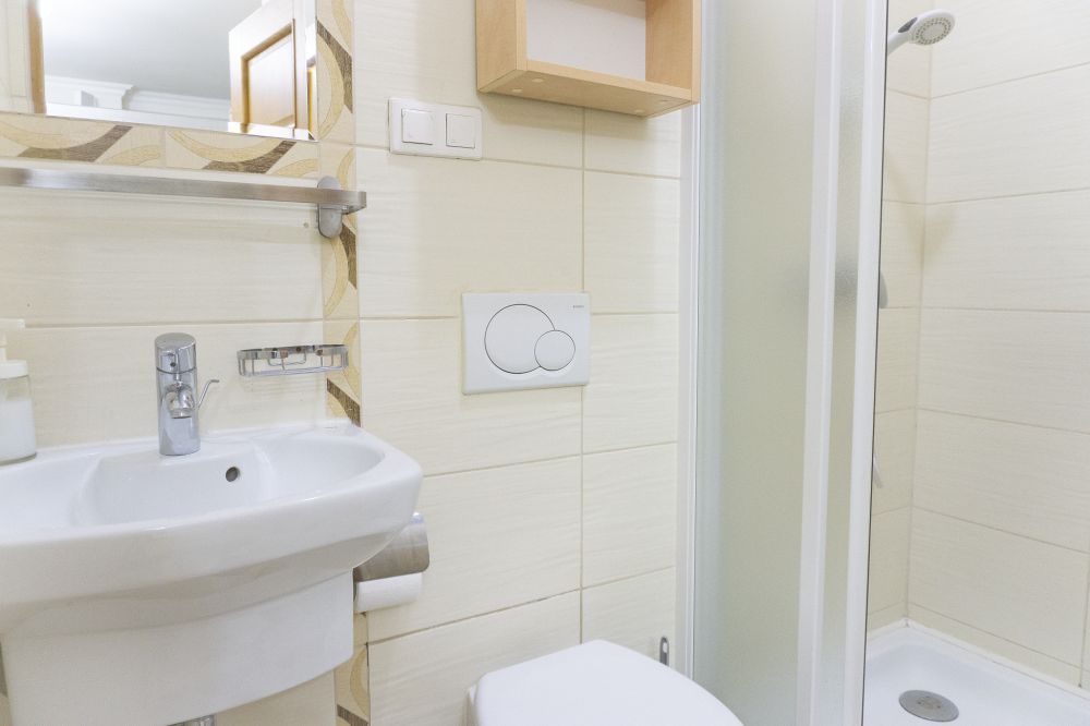Łazienka wyposażona jest w kabinę prysznicową, mydło, jednorazowa saszetka z żelem pod prysznic, szafkę z umywalką oraz suszarkę do włosów.