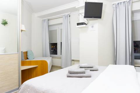 W pokoju znajduje się: podwójne łóżko (140x200cm), łóżko pojedyncze (90x200), stolik, dwa krzesła, telewizor 32" oraz szafa wnękowa.